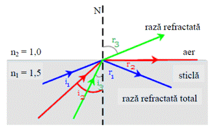 reflexia apare doar dincolo de unghiul limita iar raza reflectata se numeste "refractata total".