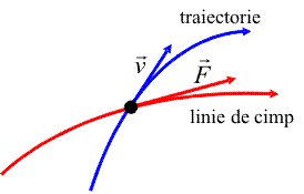 Liniile de cimp nu reprezinta traiectoriile unor particule incarcate lasate sa se miste sub actiunea cimpului (decit in cazuri cu totul particulare). Putem sa intelegem acest lucru privind figura alaturata. Pentru ca traiectoria unei particule sa fie curbata, forta trebuie sa nu fie tangenta la traiectorie ci indreptata inspre partea in care se curbeaza traiectoria. Or, directia fortei electrice este data de linia de cimp. Astfel, traiectoria nu urmeaza linia de cimp. |