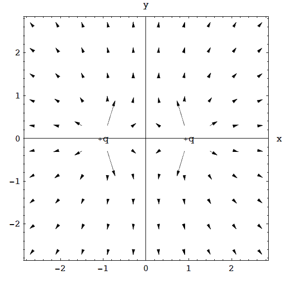 Analizati cu atentie vectorii cimpului din figura de mai jos. Puteti observa ca, acolo unde nu sunt sarcini electrice, orientarea vectorilor se modifica gradual de la o pozitie la alta. Altfel spus, daca va deplasati pe o distanta foarte mica, orientarea cimpului se modifica doar putin.