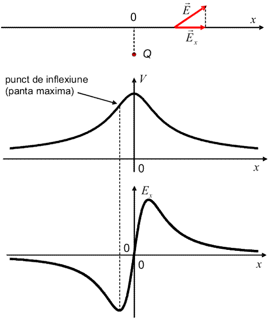 Rata de variatie a potentialului cu pozitia, adica cresterea lui V impartita la cresterea lui x, este panta graficului potentialului. Aceasta panta este pozitiva in stinga originii (unde graficul este crescator) si negativa in dreapta originii, unde graficul este descrescator. Stim din lectia precedenta ca proiectia cimpului pe axa este egala cu aceasta panta, luata cu semn schimbat. Din acest motiv, cimpul electric pe directia axei este negativ in stinga originii (este orientat spre stinga) si pozitiv in dreapta originii.