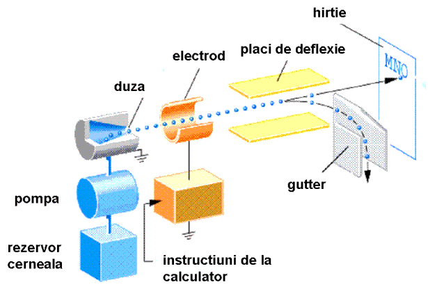 Intre cele doua placi de deflexie se mentine o diferenta de potential foarte mare. Cind capul imprimantei a ajuns intr-o zona care nu trebuie scrisa, un cimp electric este aplicat intre electrodul cilindric si capul imprimantei. Prin inductie, picaturile se desprind de cap avind o sarcina electrica neta si sunt, apoi, deflectate de cimpul electric dintre placi, astfel incit sunt impiedicate sa ajunga pe hirtie si se acumuleaza intr-un dispozitiv de colectare (gutter). In momentul in care capul imprimantei ajunge intr-o zona ce trebuie scrisa, tensiunea pe electrodul cilindric este adusa la zero, picaturile expulzate sunt neutre si, nemaifiind deflectate, ajung in punctul respectiv de pe hirtie.