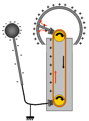 In timpurile moderne, masinile electrostatice au inceput sa fie utilizate in cercetarea structurii materiei: diferentele de potential uriase acceleraeza particulele atomice, care sunt apoi folosite in experimente de ciocniri. Incepind din 1929, la Massachusetts Institute of Technology (MIT) din SUA a fost pus la punct un nou tip de masina electrostatica, masina Van der Graaff. Sarcina este inmagazinata pe un electrod metalic, de forma sferica, gol pe interior. Acesta are o deschidere in partea de jos si este sprijinit pe o coloana dintr-un material foarte bun izolator. In interiorul coloanei, intre doi cilindri, este montata o banda transportoare izolatoare care este pusa in miscare cu o manivela sau cu un motor electric. |